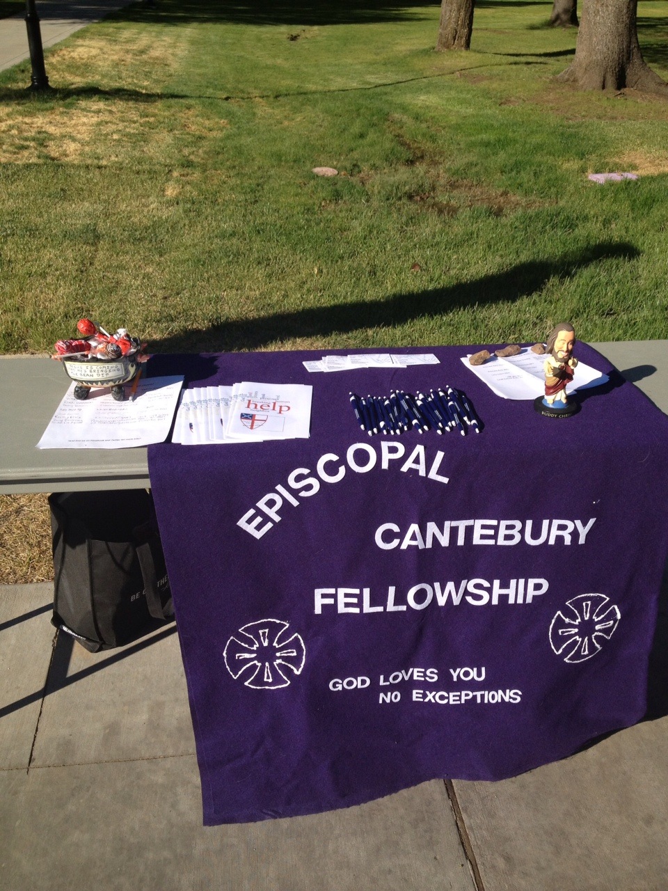 NAU Canterbury has been present for the past 3 summers. We have colorful brochures, colorful business cards, and a bobble head Jesus. Here is our table. (And yes, I set this up for a month, and JUST NOW realized that Canterbury is misspelled. See what happens when I am asked to do things without benefit of caffeine?!)